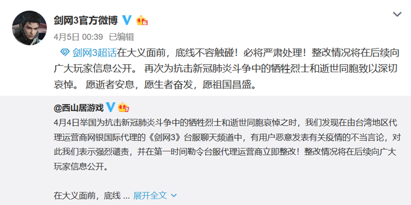 可能很多網友都沒注意到,這個清明假期,游戲圈出了一件大事。在清明全國哀悼日期間,部分臺灣網友在大陸開發的游戲“劍網3”里面肆意辱罵,發表“武漢肺炎”等不當言論,最終“劍網3”官方宣布停止臺灣服務器。