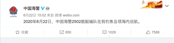 與此同時,中國也用實際行動回應。據中國海警局官方微博發布的消息,6月22日,中國海警2502艦艇編隊在我釣魚島領海內巡航。這是進入2020年以來,中國海警艦艇編隊第10次在我釣魚島領海內巡航。