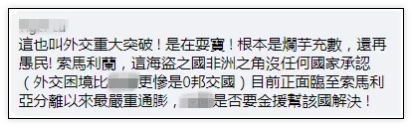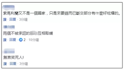 也有網友批評稱,“這也叫‘外交’突破!是在耍寶!根本是濫竽充數,還再愚民!這海盜之國非洲之角沒有任何國家承認,外交困境比臺灣更慘,是0邦交國。目前正面臨從索馬里分離以來最嚴重通貨膨脹,臺灣是否要金援幫助索馬里蘭解決!”