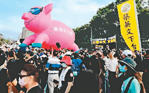 臺灣50多個團體和政黨發起大游行,反對民進黨當局明年1月1日起開放美國瘦肉精(萊克多巴胺)豬肉入境,抗議關閉中天新聞臺。圖為游行隊伍。(圖片來源:網絡)