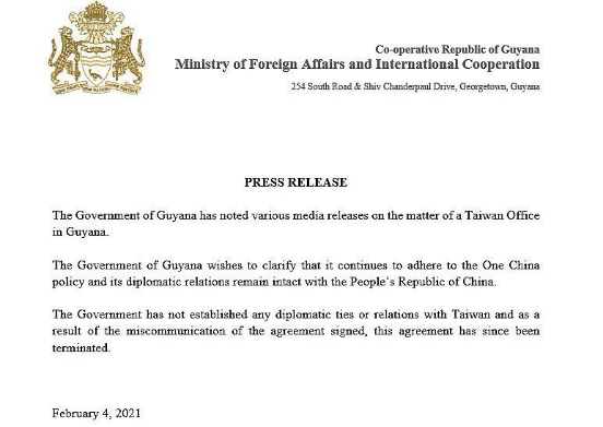 昨天(4日),民進黨當局外事主管部門宣布在圭亞那設立“臺灣辦公室”(Taiwan Office),并將其宣傳為所謂“外交突破”。沒想到不到24小時,就慘遭打臉。圭亞那外交部于4日發表聲明,表示與臺灣方面的有關協議已因“溝通有誤”終止。聲明中,圭亞那表示將堅持一個中國原則,維持與中國的外交關系。