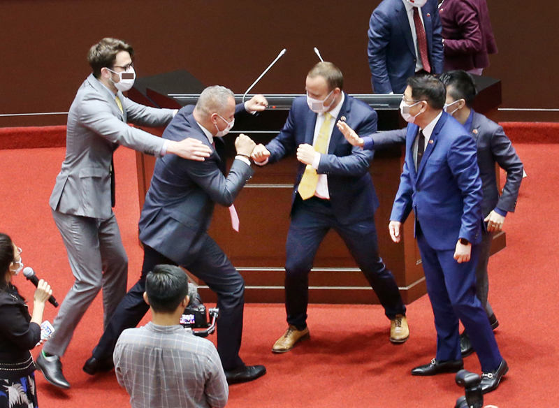 據報道,這兩名參訪團員身著西裝、面對面擺起拳擊場上的對峙姿勢,作勢扭打;而其他議員也“融入”假裝上前勸架,一行人玩得十分開心并留影紀念。對此,陪同參訪的綠營民代稱:“對方是用這種方式來表達,民主本來就是多元,訪問團對臺灣的民主是很肯定的。”不少臺媒竟然還反以為榮,以“名揚國際”“打架超紅”“國際認證”“臺灣印象”為題報道此新聞。
