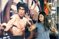 粉絲在位于東京新宿的新宿武藏野館中真人大小的李小龍海報前擺出武打造型。