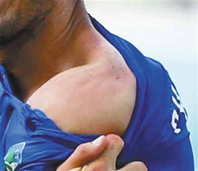 基耶利尼展示蘇亞雷斯咬人留下的“齒印”,卻換不來裁判的同情。
