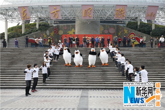 《馬達加斯加的企鵝》將中國首映禮設(shè)置在上海絕非偶然,據(jù)悉,片中四只企鵝將要在上海開展一場秘密特工任務(wù)。12日當天下午,在上海東方明珠,由150人組成的快閃小分隊在影片主題曲《Celebrate》的伴奏下,大跳企鵝舞,宣告影片即將在中國登陸。