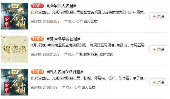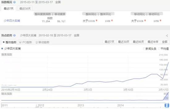 在《少年四大名捕》中,魚塘主拼命耍酷,陳偉霆一直在賣萌,何晟銘畫上邪魅的紫色眼影,貌似還有些秀基情……這哪里是電視劇,這分明是男神養(yǎng)眼視覺秀,《少年四大名捕》首播開篇打斗戲長(zhǎng)達(dá)半小時(shí),密集的特效運(yùn)用令人應(yīng)接不暇,被觀眾稱贊具有復(fù)制《古劍》奇跡的潛質(zhì)。在魔幻特效的加持下,畫面顯得行云流水、出神入化。優(yōu)秀的劇情、完美的特技、加上養(yǎng)眼的面孔,怪不得《少年四大名捕》成為時(shí)下最火電視劇,沒有之一。在首播后第一天的新浪微博電視劇話題榜上,前三位中居然有兩個(gè)和該劇相關(guān),第一名是#少年四大名捕#,第三名為#少年四大名捕317開播#。其中話題#少年四大名捕#已經(jīng)取得5.5億的閱讀量和高達(dá)75.3萬的討論量(截至3月18日12時(shí)),而該劇百度指數(shù)上的表現(xiàn),也可以反映出首播有多么萬眾期待,首播之后,一度接近18萬的指數(shù)高位。