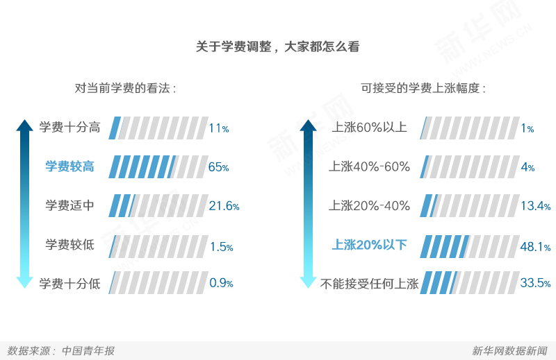 相關調查顯示,76%的受訪者認為當前大學的學費太高,而近半數的受訪者表示僅能接受學費上漲20%以下。也有受訪者稱,學費上漲可以理解,但上漲的原因、資金流向,一定要向學生、家長及社會說明,“上漲的學費要用到學生身上”。