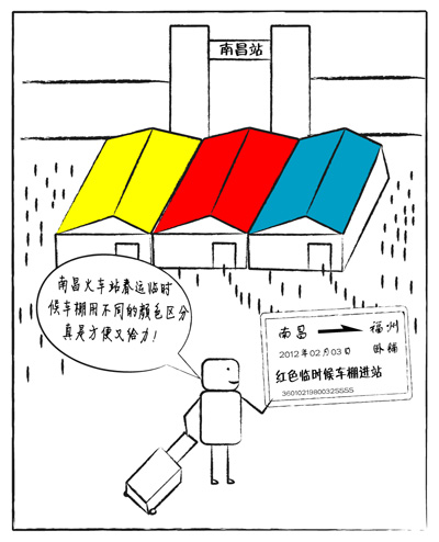 臨時侯車棚有黃、紅、藍三種顏色,而旅客買到不同車次的車票,下面都印有在哪種顏色的車棚底下侯車。南昌火車站一個小動作,減少了旅客到處打聽侯車地點的麻煩,帶來了溫暖和溫馨。(2月2日中廣網)