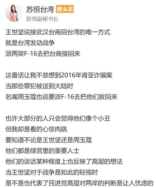 雖然第二批滯留湖北的臺胞終于在經過一個多月的艱難等待后回到了家鄉,但之前民進黨籍臺北議員王世堅說的那句話聽來仍然令人觸目驚心。當時他說“接武漢臺商回臺灣的唯一方式就是臺灣發動戰爭,派兩架F-16去把臺商接回來”。這話是否有些耳熟?沒錯,2016年肯尼亞電信詐騙案中,當那些臺灣籍的罪犯按國際慣例被送到大陸時,臺灣名嘴周玉蔻也說過要“派F-16去把他們救回來”。