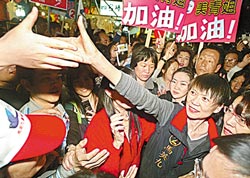 向來低調(diào)的馬英九夫人周美青被藍(lán)營視為助選要角,圖為2008年她南下高雄瑞豐夜市幫馬拉票(圖片來源:臺灣媒體)