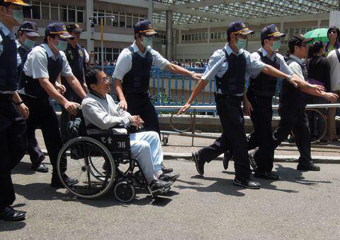 陳水扁5月在大批警力戒護下檢查身體,圖為離開長庚醫院情形。(圖片來源:臺灣今日新聞網)