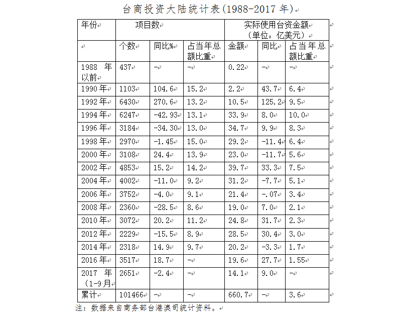 上世紀八十年代初,第一批臺商假借第三地之名,迂回進入大陸投資,開啟了兩岸經濟交流與合作的序幕。1987年10月,大陸表示“熱情歡迎臺灣同胞到祖國大陸探親旅游”,兩岸交流的大門終被打開,臺商對大陸投資快速增長,并成為推動兩岸經濟交流與合作的重要力量。據我商務部統計,截止2017年9月,累計批準臺商來大陸投資項目10.1萬個,實際使用臺資660.65億美元(由于臺當局對臺商投資大陸有重重限制,多年來大量臺資通過英屬維爾京、開曼群島、薩摩亞、毛里求斯和巴巴多斯等自由港轉投資大陸,若加計此類自由港的臺資,我實際利用臺資金額將高于商務部統計額),按照實際使用外資統計,臺資占我累計實際吸收境外投資總額的3.6%。目前臺灣是大陸第二大投資來源地,大陸是臺灣最大的投資目的地。臺商對大陸的投資早期多為勞動密集型傳統制造業的中小企業,現在則向高科技產業、金融等現代服務業產業延伸,企業也以大型上市柜公司為主;投資區域從福建、廣東等沿海地區逐步向中部、西部轉移,投資區域產業聚集效應明顯;投資策略從過去的“三來一補”加工外銷導向逐漸轉變為與大陸當地產業鏈緊密結合,目標市場從歐美轉向大陸內需市場。