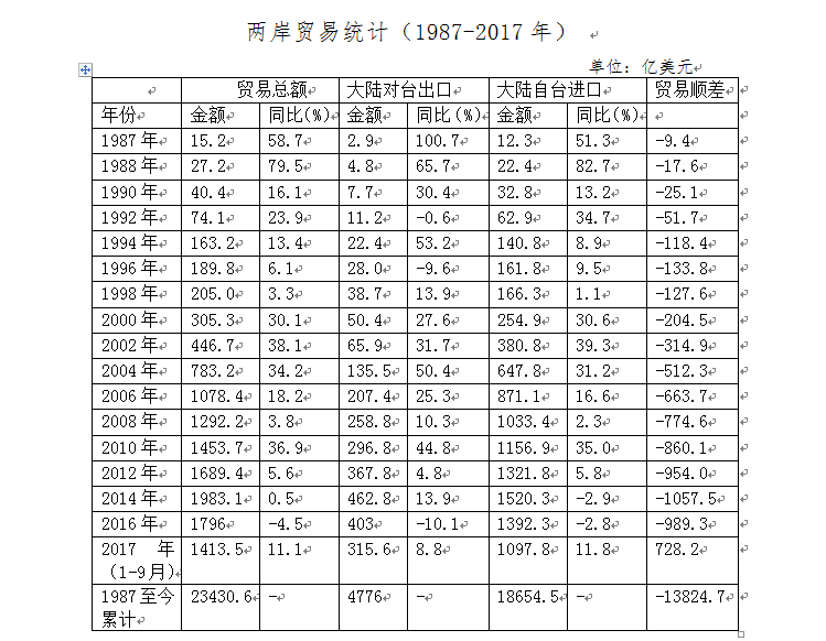 在投資帶動下,兩岸貿易快速發展。1987年,兩岸貿易總額僅為15.2億美元,現在每年超過1700億美元。大陸是臺灣最大的出口市場、最大的貿易順差來源地,三十年來兩岸貿易額累計達23430.6億美元,順差額累計13824.7億美元。