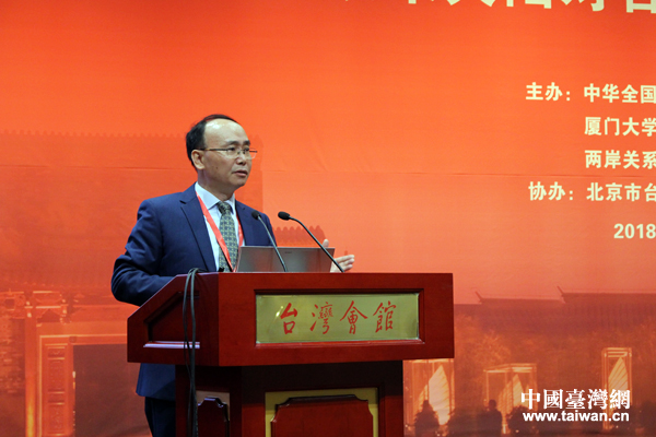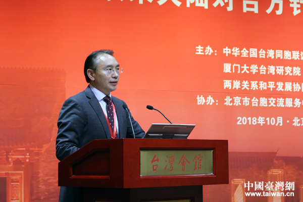 兩岸關系和平發展協同創新中心主任、廈門大學臺灣研究院教授劉國深在研討會上發言。(中國臺灣網 張潔 攝)