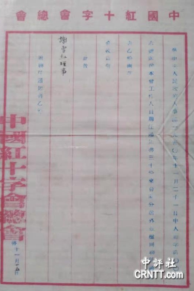 我曾見中國紅十字會總會致謝雪紅理事函(圖一),其文曰:“準中央人民政府人事部1950年11月21日中人廳字第0066號函送本會工作人員聘任通知書30份來會,(字跡模糊)分送外,茲檢同聘任通知書乙份函請查收為荷。此致謝雪紅理事。中國紅十字會總會啟。11月25日”。中央人民政府人事部是1950年9月5日設立的,負責各類干部的管理工作;其時,中國紅十字會是“中央人民政府領導之人民衛生救護團體”,其理事聘任由中央人民政府人事部負責。