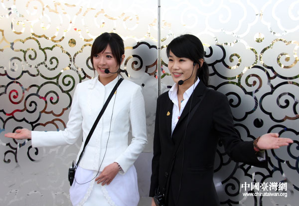 “歡迎來到臺灣館!”甜美和善的笑臉,悅耳親切的語調,儀態萬方的身姿,舉手投足無不展現“臺式”待客之道。游客來到臺灣館,這第一景就是享受“領航員”的優美外形和優質服務。