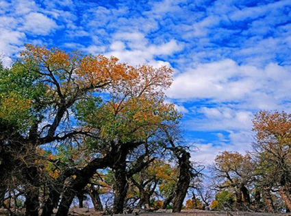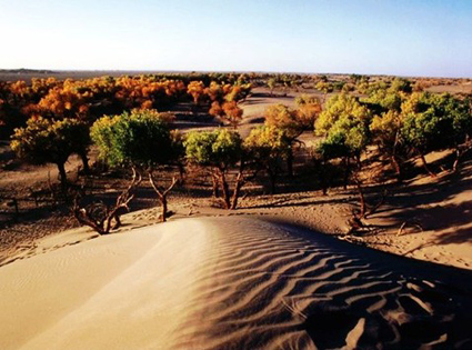 枯死一片,成活另一片,胡楊樹間有沙丘,是否還在繼續推進?勿曉得。還有兩棵著名的胡楊樹,不得不提。它們的確是身材出眾,不同凡響。是子母樹還是雌雄數現在已經記不清楚了。