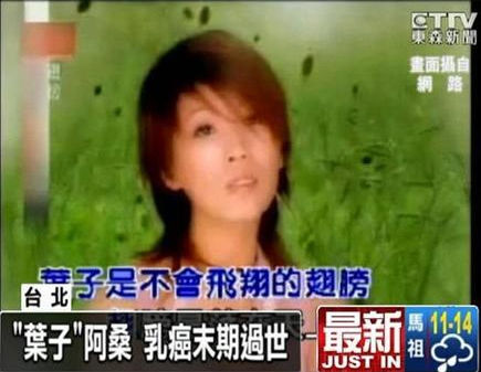 據臺灣東森新聞網最新報道,曾經演唱過《寂寞在唱歌》、《葉子》的歌手“阿桑”,因為去年十月罹患乳癌末期,在4月6日早上八點半,病逝于新店慈濟醫院,年僅34歲。