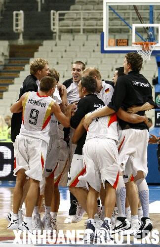 7月20日,德國隊隊員慶祝勝利。當日,在希臘雅典進行的北京奧運會男籃資格賽爭奪第三名的比賽中,德國隊以96比82戰勝波多黎各隊,獲得北京奧運會的參賽資格。 新華社/路透