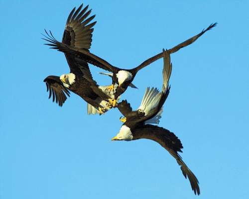 中新網9月19日電 據香港《大公報》報道,美國阿拉斯加州上空,最近上演了一幕“三鷹爭魚”的空中大混戰。其中一只白頭鷹在湖中捕得一條魚飛回家途中,兩只同類上前挑戰,一度多爪交纏。三雕看似在殊死相爭,難分難解,但拍照的業余攝影師哈里.埃根斯說,奪魚戰持續了不過數秒。挑戰者意不在魚,只是好勇斗狠,想找對手決一雌雄。