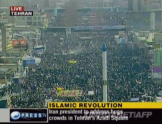 這張2月11日伊朗電視臺的電視截圖顯示,數(shù)十萬伊朗民眾在德黑蘭的自由廣場集會,慶祝伊斯蘭革命勝利31周年。1979年2月1日,領導伊朗伊斯蘭革命的霍梅尼結束流亡生涯返回伊朗,巴列維王朝政權在2月11日倒臺,伊朗伊斯蘭革命取得勝利。新華社/法新