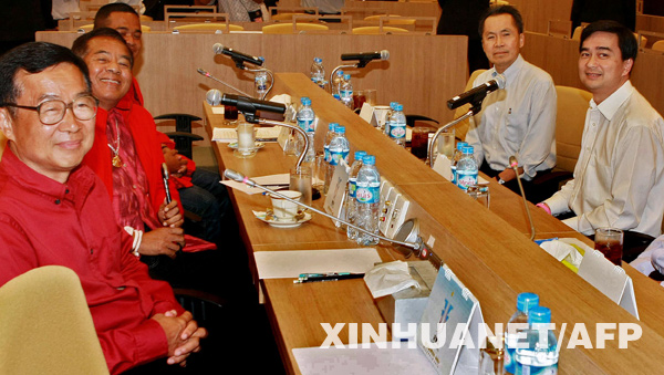 3月29日,泰國總理阿披實(右一)在曼谷會見“紅衫軍”代表。泰國總理阿披實與“紅衫軍”代表當晚舉行的第二輪談判仍未能就解散國會下議院的時間達成協議。新華社/法新