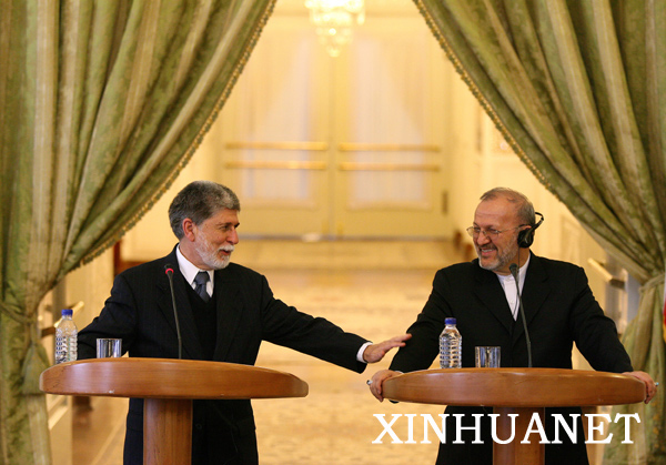 4月27日,在伊朗首都德黑蘭,伊朗外長穆塔基(右)與到訪的巴西外長阿莫林舉行聯合記者會。穆塔基表示伊朗希望在不遠的將來實施核燃料交換方案,阿莫林則重申了巴方反對對伊朗實施進一步制裁的立場。阿莫林當日抵達德黑蘭開始對伊朗進行為期兩天的訪問。新華社發(哈拉比薩斯攝)