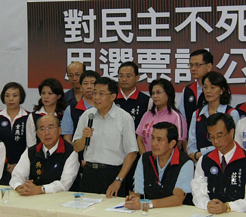 高雄市長選舉官司定讞,敗訴的黃俊英由國民黨主席吳伯雄、馬英九陪同召開記者會,表達遺憾。(中央社圖片)
