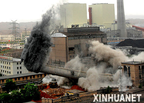 資料圖片:2007年6月16日,寧夏英力特中寧電廠的煙囪被爆破拆除。