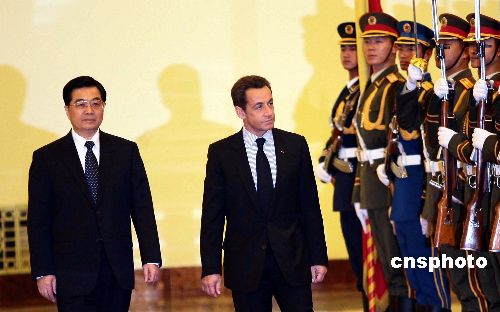 十一月二十六日,中國國家主席胡錦濤在北京人民大會堂舉行儀式歡迎來訪的法國總統薩科奇。 中新社發 盛佳鵬 攝