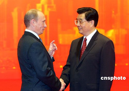 六月十五日,上海合作組織成員國元首理事會第六次會議在上海開幕。圖為中國國家主席胡錦濤歡迎俄羅斯總統普京參會。 中新社發 廖文靜 攝