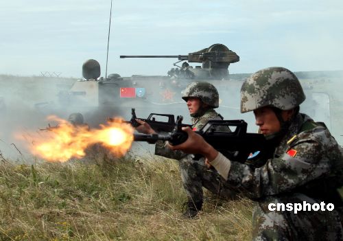 8月15日,參加“和平使命——2007”上海合作組織武裝力量聯合反恐軍事演習的中方參演部隊,進駐切巴爾庫爾演習場以來,進行緊張的分練、合練和重點課目的訓練。圖為中方參演官兵對目標進行射擊。 中新社發 張雷 攝