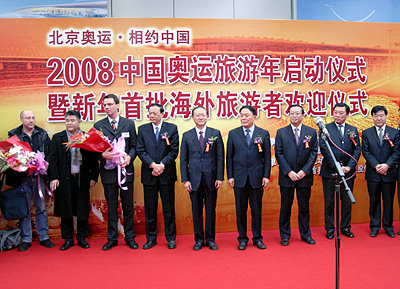 中新網1月2日電 據國家旅游局網站消息,2008年元月一日上午10:50分,CA932航班平穩地降落在北京首都國際機場。飛機艙門打開時,德國伊卡魯斯旅行社副總裁萊爾夫·琥珀先生接到了來自北京市旅游局工作人員送上的鮮花。他所率領的德國234名游客成為2008年北京入境的第一批旅游者。這標志著2008年中國奧運旅游年正式啟動。