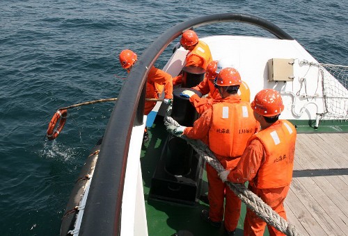 2007年5月14日,北海救助局“北海救131”輪船員在打撈沉船雜物。當(dāng)日,交通部救撈系統(tǒng)又增派兩艘救助船舶和一架固定翼飛機(jī)繼續(xù)加緊對(duì)韓國籍遇險(xiǎn)貨輪“金玫瑰”的海上搜救和油污清理工作。至此,交通部救撈系統(tǒng)共派出3艘救助船舶,2架救助直升機(jī)和1架固定翼飛機(jī)全力參與搜救工作。據(jù)了解,目前“金玫瑰”貨輪沉沒位置已被鎖定,同時(shí)船體在海底的姿態(tài)也被探明,為下一步搜救和布設(shè)航標(biāo)提供了可靠數(shù)據(jù)。 5月12日3時(shí)許,韓國籍“金玫瑰”貨輪在煙臺(tái)海域與一艘集裝箱船發(fā)生碰撞后沉沒,船上16名船員至今下落不明。 新華社記者 朱崢 攝