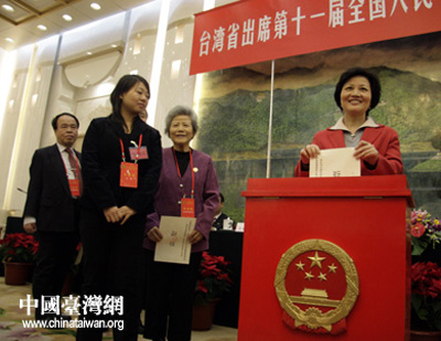 中國臺灣網1月12日消息 1月12日下午,臺灣省出席第十一屆全國人民代表大會代表協商選舉會議,在人民大會堂臺灣廳召開。120名協商選舉會議成員以無記名投票差額選舉的方式,選舉產生了13名臺灣省第十一屆全國人大代表。