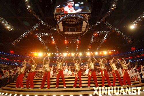 1月21日,北京2008年奧運會歌曲宣傳推廣啟動晚會在北京奧林匹克籃球館舉行,北京2008年奧運會歌曲征集評選活動組委會推出首批2008年奧運會歌曲音樂電視。 新華社記者羅曉光攝