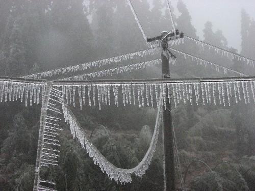 1月27日,高山輸電線路掛滿冰凌。當日,受北方強冷空氣南下影響,福建省長汀縣遭受罕見的冰凍災害,轄區6個鄉鎮高山地帶的輸電線路因覆冰嚴重而損毀,造成約10萬名村民供電中斷。目前電力部門正在加緊搶修。新華社發(林建武 攝)