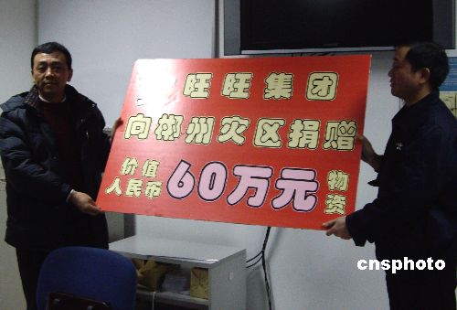 今年一月中旬以來,發生在大陸多個省份的嚴重雨雪冰凍災害深深牽動著臺灣同胞的心。臺企旺旺集團在自身遭受了嚴重經濟損失的情況下,緊急生產和調撥了價值四百一十五萬元人民幣的救災物資運往各災區,其中一批價值六十萬元的食品、飲料安排給湖南受災最為嚴重的郴州地區。