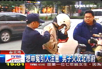 臺警方調(diào)查指出,黃則霖有詐欺和傷害前科,他昨天下午帶著空啤酒瓶,先到三重一家加油站加了50塊錢新臺幣的汽油后,再搭公交車到臺“立法院”,但由于臺“立法院”沒人,隨后才轉(zhuǎn)往臺北市政府。當(dāng)時廣場前正好有燈會,黃則霖把汽油彈奮力丟上臺北市政府大門,宣傳廣告牌被燒地一片焦黑。還好站崗衛(wèi)兵緊急滅火,并將他制伏,才沒有讓災(zāi)情擴(kuò)大。(章潘)