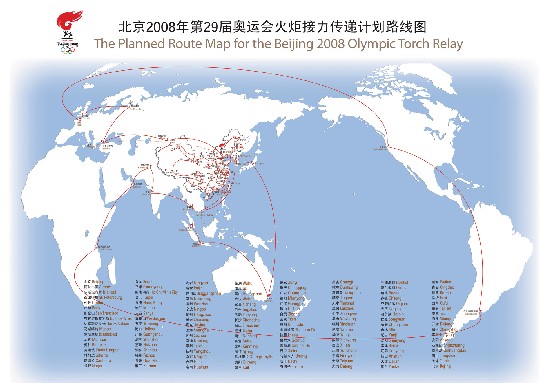4月26日,北京2008年第29屆奧運(yùn)會(huì)火炬接力傳遞計(jì)劃路線和火炬發(fā)布儀式在北京中華世紀(jì)壇舉行。圖為北京奧組委公布的北京奧運(yùn)會(huì)火炬接力傳遞計(jì)劃路線圖。新華社發(fā)