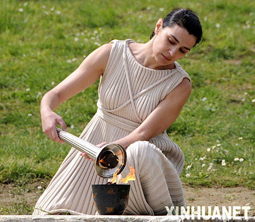 3月22日,扮演最高女祭司的瑪利亞·娜芙普利都在彩排儀式上點燃火種罐。當日,希臘奧林匹亞再次舉行北京奧運會圣火采集儀式彩排,并成功試采到新的火種。 新華社記者 吳曉凌攝