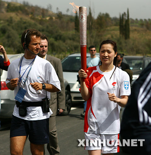 尼古拉澤斯沉穩地等待祭司們退場,然后起身,慢跑穿過整個古奧林匹克競技場,向現代奧林匹克之父顧拜旦墓地的方向跑去。在那里,前游壇名將羅雪娟正在等待成為首個觸摸北京奧運圣火的中國人。而奧運火炬希臘境內傳遞活動也就此正式拉開帷幕。