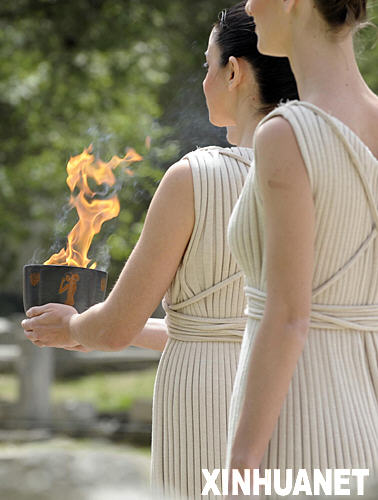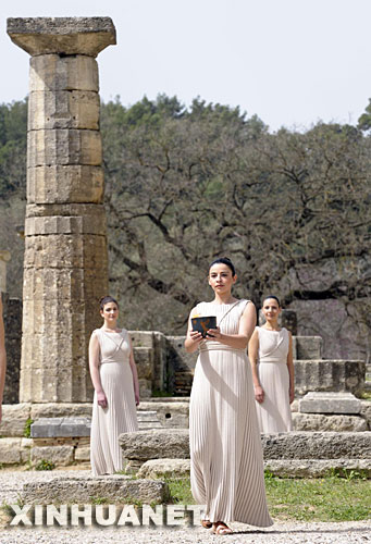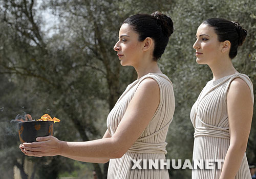 3月24日,北京奧運會圣火取火儀式在希臘奧林匹亞舉行。圖為女祭司手捧火種罐。 新華社記者戚恒攝