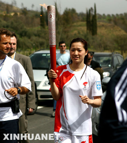 3月24日,中國火炬手羅雪娟(右)在火炬傳遞過程中。 新華社記者畢明明攝