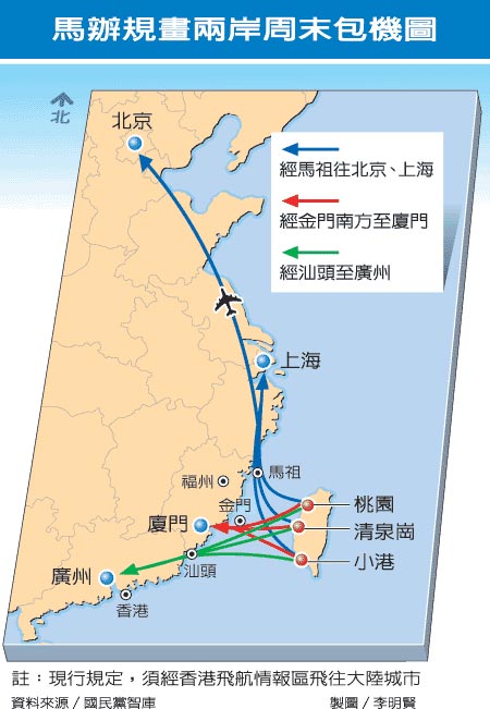 報道稱,為加速兩岸周末包機(jī)進(jìn)程,馬英九昨聽取智庫永續(xù)發(fā)展組召集人陳世圯簡報,就直航時間、航點等細(xì)節(jié)交換意見,智庫規(guī)劃兩岸飛行航線采“截彎取直”模式,最多可以節(jié)省近一半的飛行時間,馬當(dāng)場裁示“積極辦理”。
