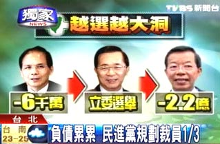 TVBS電視臺(tái)報(bào)道稱(chēng):民進(jìn)黨在“大選”中不只輸?shù)矫撗澴樱欠了一屁股債,游錫堃任民進(jìn)黨主席時(shí),民進(jìn)黨已經(jīng)負(fù)債6千萬(wàn)(新臺(tái)幣,下同),陳水扁接任后又燒錢(qián)拉抬“立委”選情,輪到謝長(zhǎng)廷選舉時(shí)慘敗,如果不加計(jì)選舉補(bǔ)助款,民進(jìn)黨債務(wù)大約超過(guò)2億。