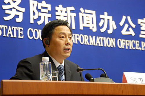 圖為國務院新聞辦新聞局局長郭衛(wèi)民向大家發(fā)布5月17日四川汶川地震抗震救災工作最新進展情況。中國政府網(wǎng) 張泳攝
