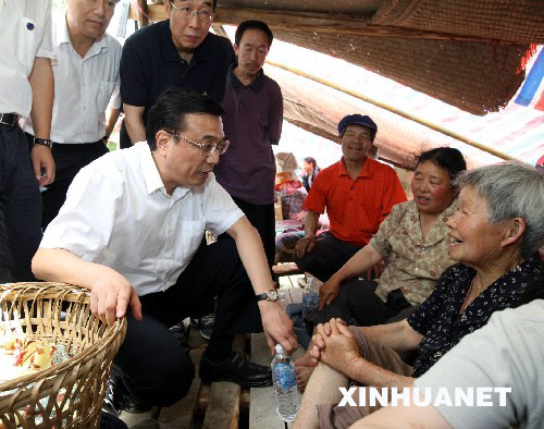 在平武縣行進途中,李克強看望慰問受災群眾,詳細詢問他們的生活情況。他說,做好災區(qū)群眾安置工作,首先是保障受災群眾吃、喝、住、穿,要落實中央決定,開倉賑災,扶危濟民,還要加快生產(chǎn)和調(diào)集大量帳篷,保障安置災區(qū)群眾需要。
