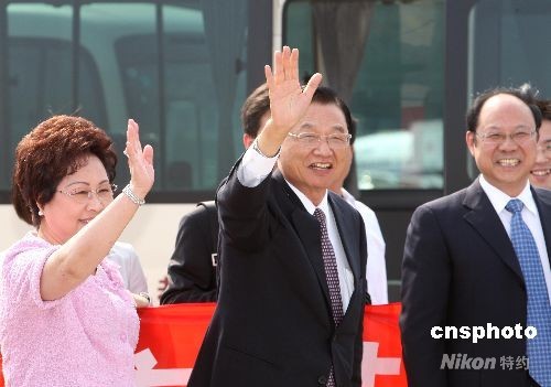 十一日下午三時十五分許,臺灣海峽交流基金會董事長江丙坤率;鶗韴F抵達北京首都機場,向在場的中外媒體揮手致意。 中新社發 趙振清 攝