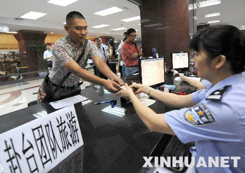 7月1日,張先生成為首位在北京市公安局出入境管理處辦理赴臺游手續(xù)的市民。當天,北京市公安局出入境管理處開始為首批314人辦理赴臺旅游的相關(guān)手續(xù)。入境管理處保證申請人將在7月2日下午前拿到赴臺簽注和《大陸居民往來臺灣通行證》。 新華社記者 李文攝